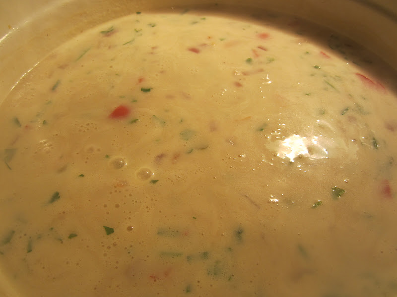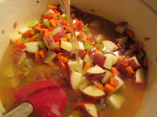 Cook for about 3 minutes and the add potatoes and continue cooking until onions are translucent.