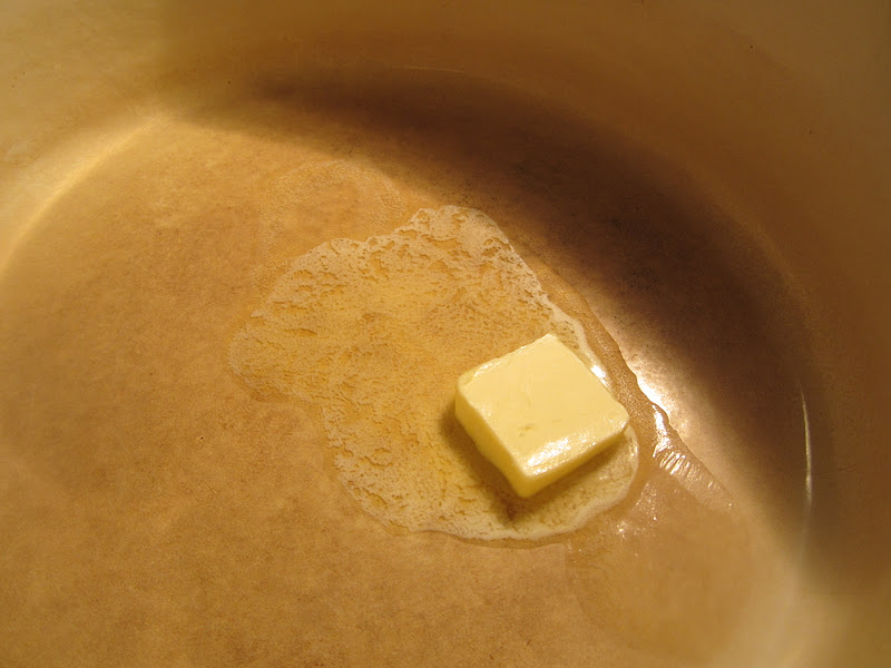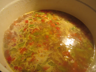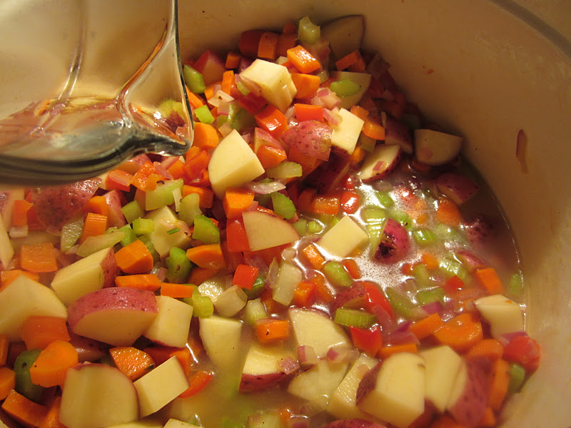 Melt butter in a large dutch oven. Add onions, carrots, celery and red pepper.