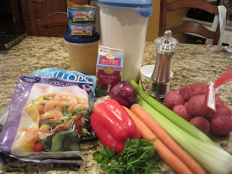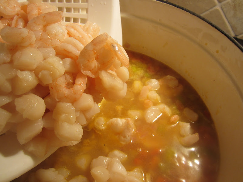 Add clams, scallops and shrimp to chowder. Gradually whisk in flour mixture.